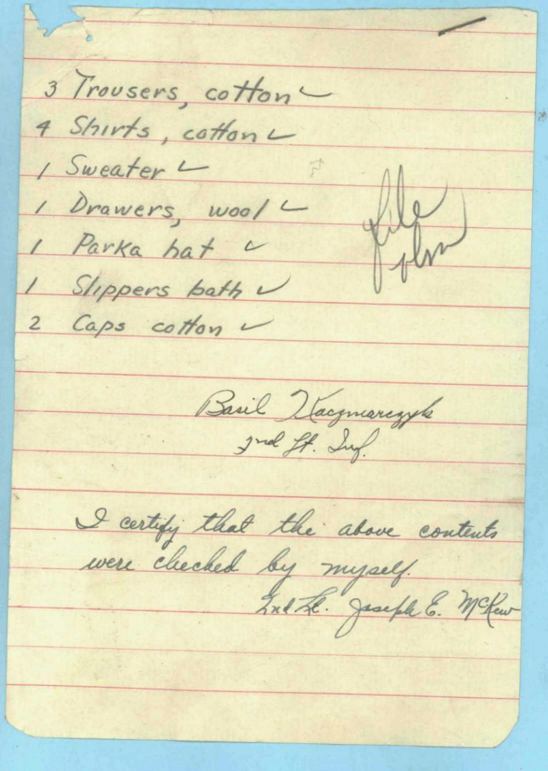 The image on the right is a list Kaczmarzyk made to verify he still had all of his belongings issued by the army.